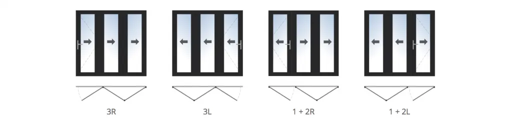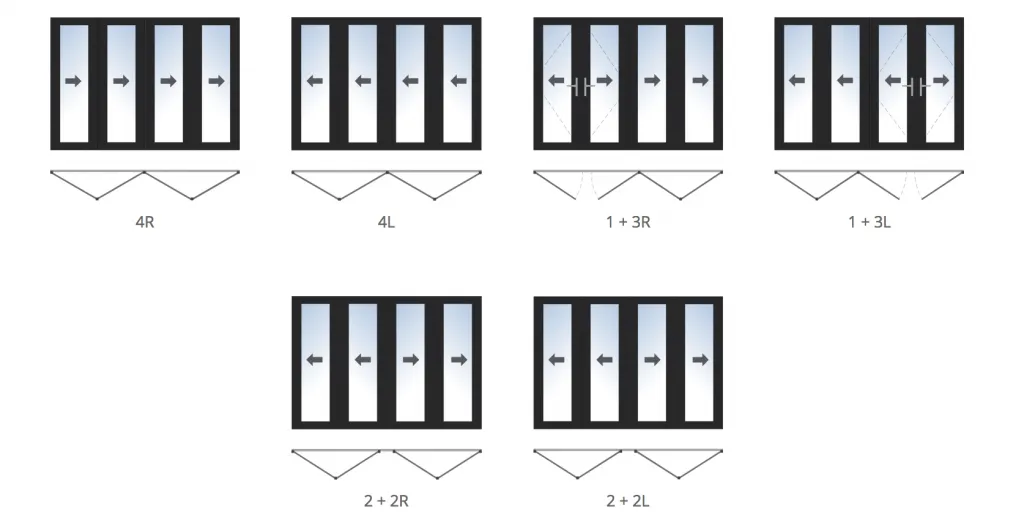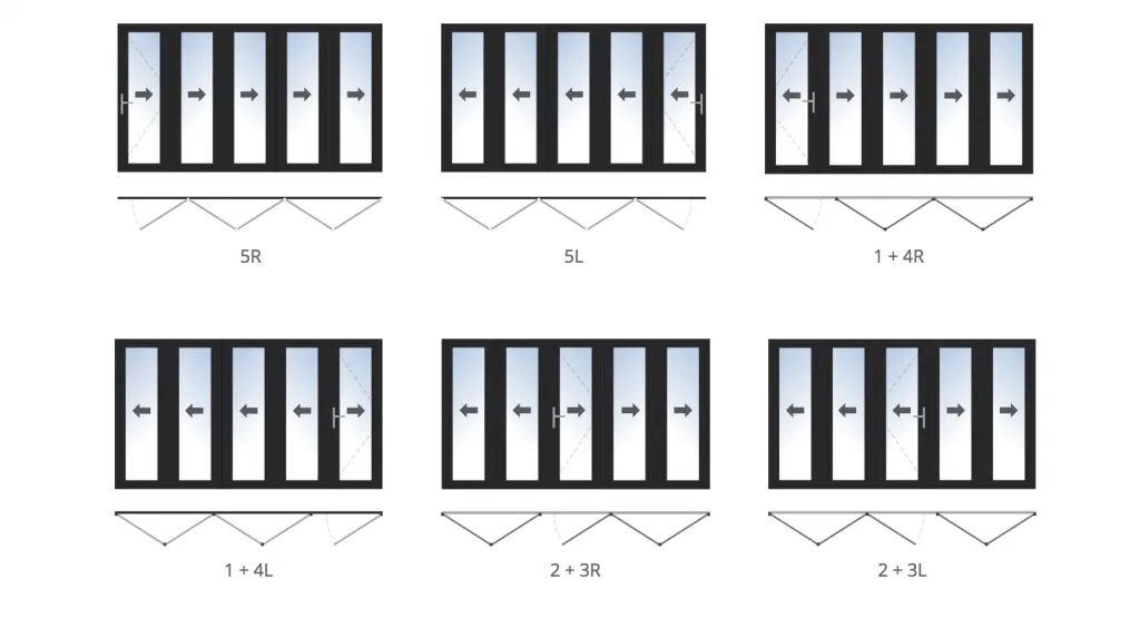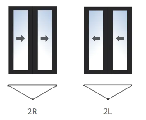 - Two numbers joined by a plus sign with a letter at the end, as in “1 + 2R”, stands for 3 total panels with 2 folding to the right and 1 swinging out on the left. The number with the attached letter “L” or “R”, represents the active panel.