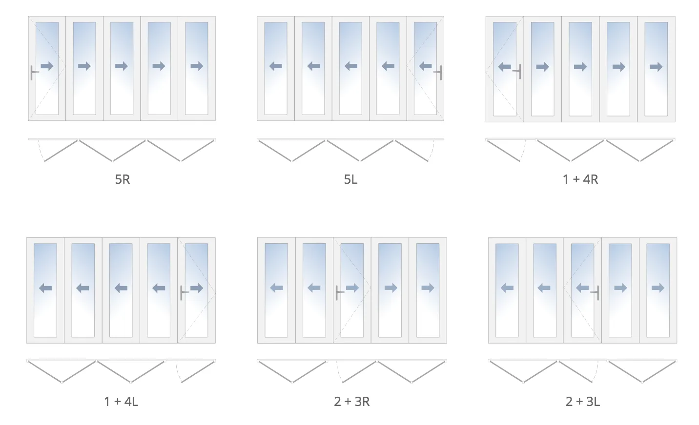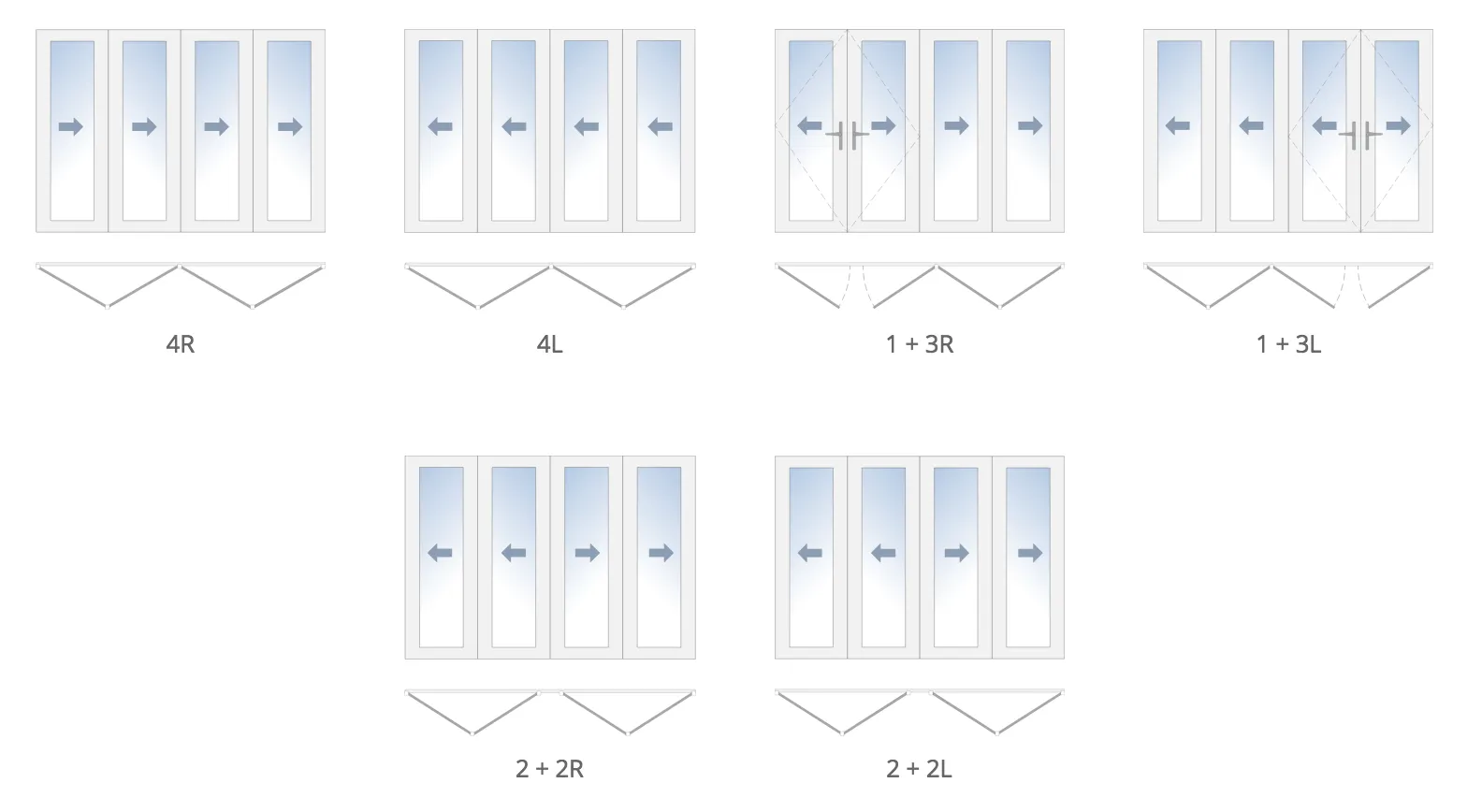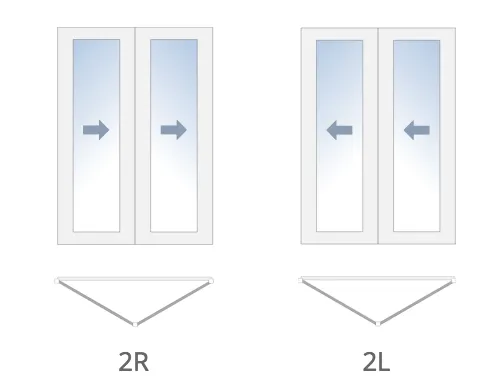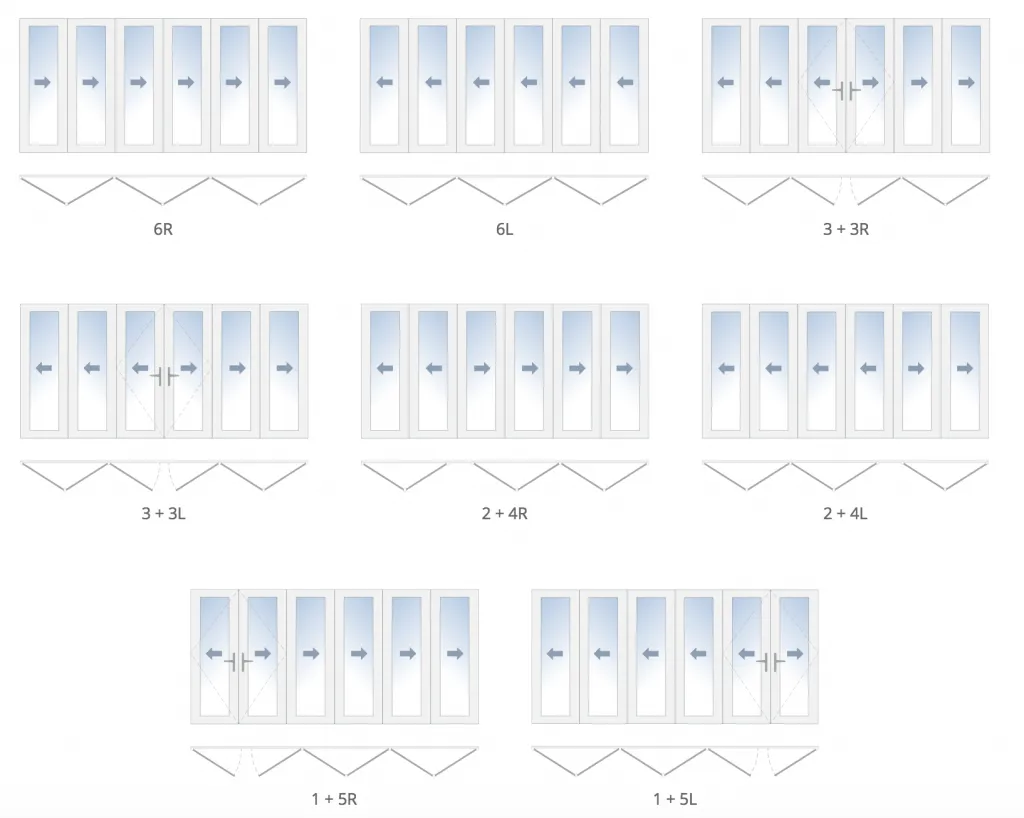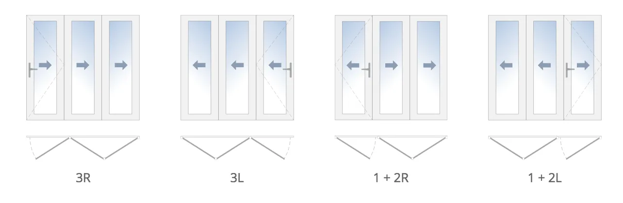 - Two numbers joined by a plus sign with a letter at the end, as in “1 + 2R”, stands for 3 total panels with 2 folding to the right and 1 swinging out on the left. The number with the attached letter “L” or “R”, represents the active panel.