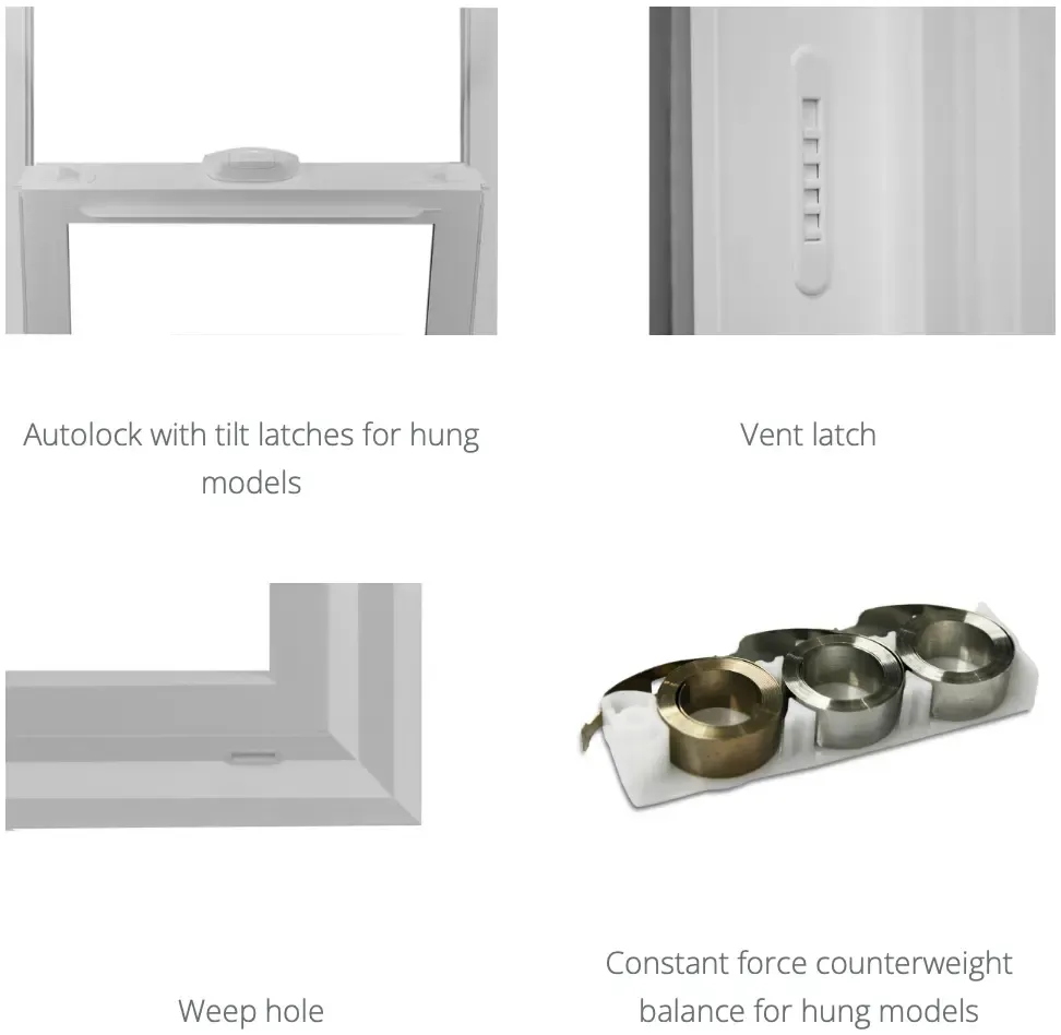 Automatic locks for horizontal and hung windows close and lock with one simple click. Weep hole design prevents debris obstruction to vent water efficiently. Constant force counterweight ensures effortless opening of hung models.